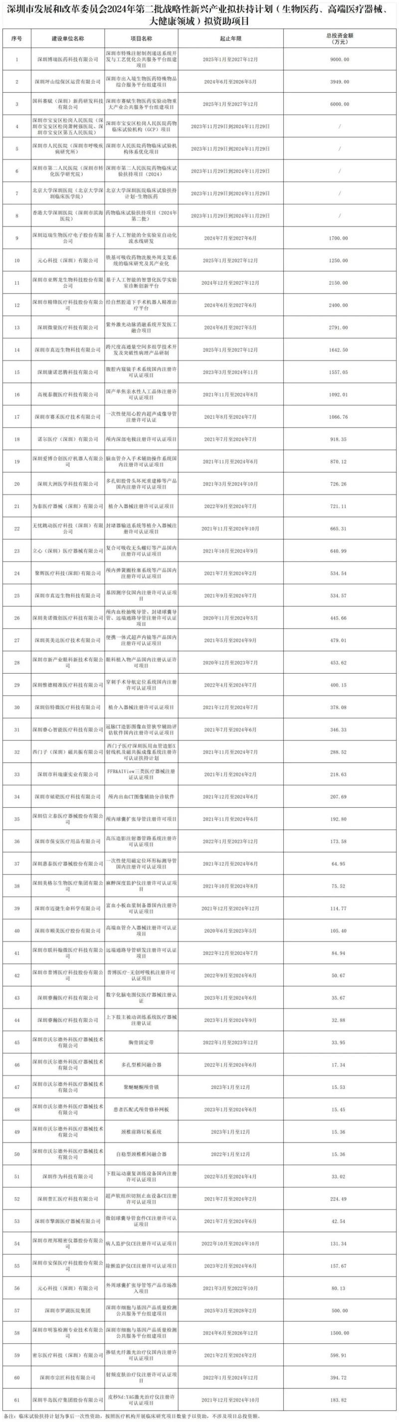 近日,深圳市发展和改革委员会发布了2024年第二批战略性新兴产业扶持计划(生物医药、高端医疗器械、大健康领域)拟资助项目,公示时间为5个工作日。我们通过查阅附件表格后发现,本批共有61个拟资助项目,包括医药领域临床前研究、临床试验扶持、注册许可扶持等,总投资金额最高的为9000万元。深圳发改委将根据此前公布的相应领域的专项资金项目申报指南,按总投资金额的一定比例对企业进行补贴。