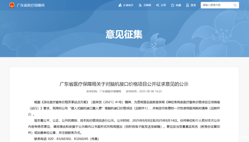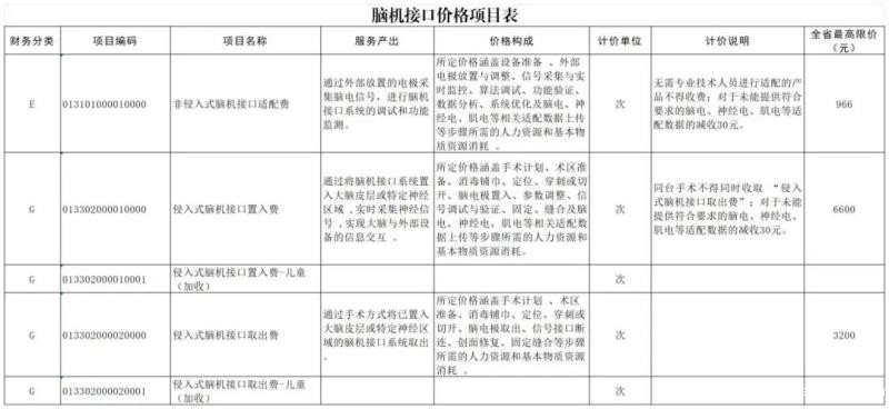 近日,广东省医疗保障局公布“侵入式脑机接口置入费”等脑机接口价格项目,同时制定可收费的一次性使用医用耗材清单,并将价格项目进行公示。公示时间:2025年8月8日至2025年8月14日。
