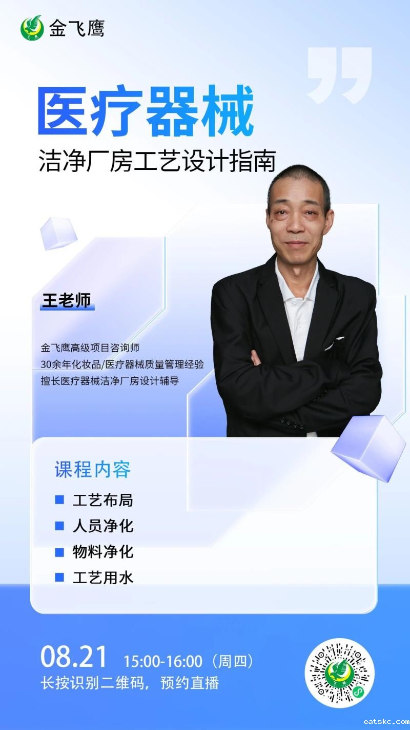 8月21日下午3点,betway必威西盟体育官网入口高级项目咨询师,有着30余年化妆品/医疗器械质量管理经验,尤为擅长医疗器械洁净厂房设计辅导的王老师给大家带来《医疗器械洁净厂房工艺设计指南》,无论您是正在规划新的生产场地,还是希望提升现有厂房的运行效率,都能从课程中获得专业指导,感兴趣的朋友记得提前预约!
