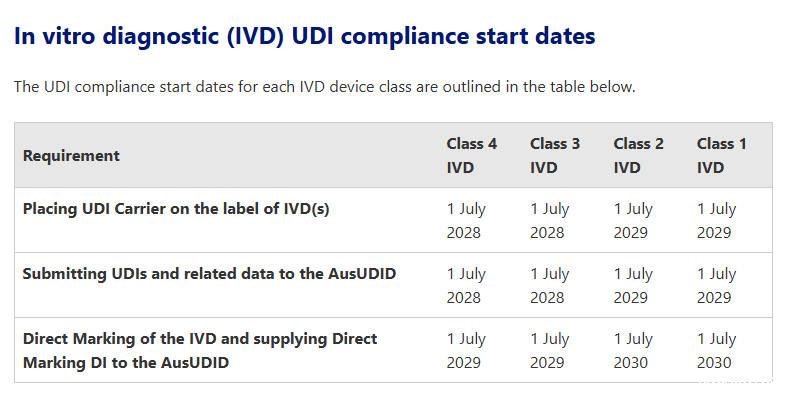 这其中,最早实施UDI的为Ⅲ类及Ⅱb类医疗器械,需要在2026年7月1日起将UDI载体放在设备标签上及向AusUDID 提交 UDI-DI 和相关数据,最晚的则是1类和2类IVD,需要在2030年1月1日完成有关UDI的所有操作。
