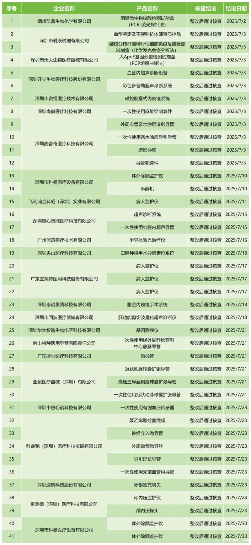 近日,广东省药监局官网公布2025年7月医疗器械注册质量管理体系核查结果,包括深圳市科曼医疗设备有限公司的体外除颤监护仪、广州信筑医疗技术有限公司的半导体激光治疗仪、广东宝莱特医用科技股份有限公司的病人监护仪、业聚医疗器械(深圳)有限公司的冠状动脉球囊扩张导管、科睿驰(深圳)医疗科技发展有限公司的一次性使用无菌血管内导管等共计41款产品,均为“整改后通过核查”。具体明细见下方表格: