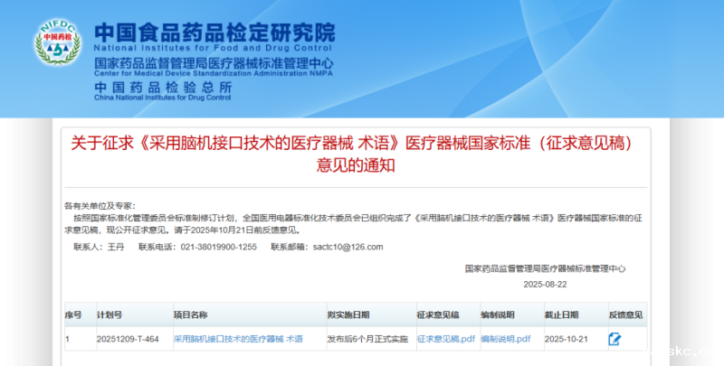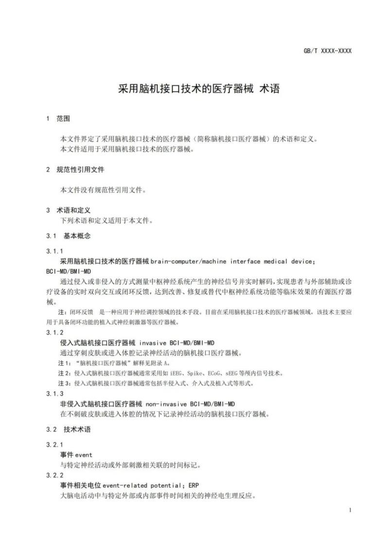 近日,国家药品监督管理局医疗器械标准管理中心发布《采用脑机接口技术的医疗器械 术语》医疗器械国家标准的征求意见稿,并向社会公开征求意见,同时提到,该标准将于发布后6个月正式实施。