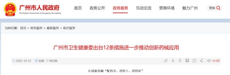 日前,广州市卫生健康委印发《广州市卫生健康委员会进一步推动创新药械应用十二条措施》(以下简称《措施》),从畅通创新药械入院全流程、加强创新药械临床推广应用、优化创新药械发展生态三方面推出措施,以提升疾病诊疗水平与医疗服务能力,保障人民健康,让创新药械在广州“配得齐、用得上、用得好”。 一、畅通创新药械入院全流程